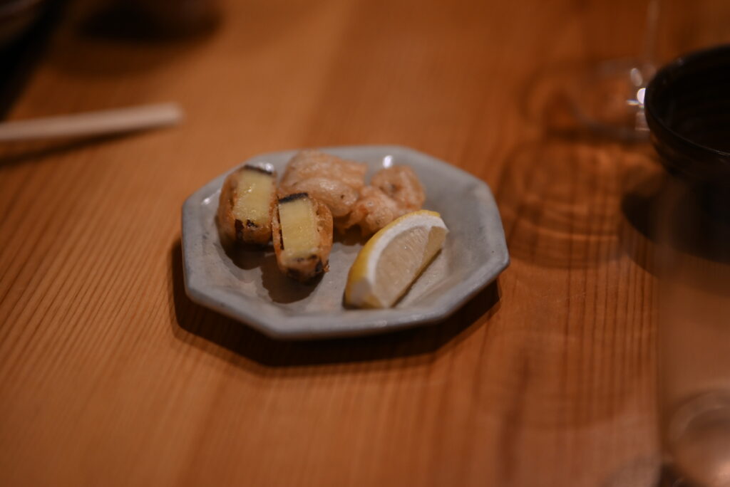 あきたシャポンの鳥皮と柚子皮。紅葉おろし添え