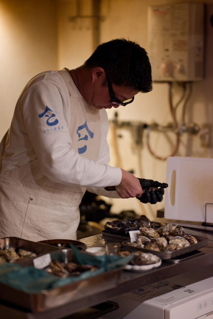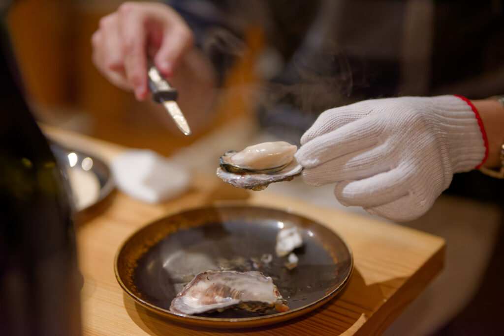 生牡蠣。剥いては提供、剥いては提供する早川氏。