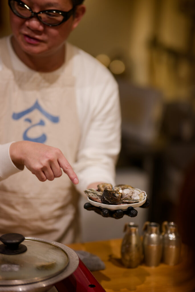 「この後、生牡蠣を5種お出しします」とアナウンスを始めた早川氏。笑