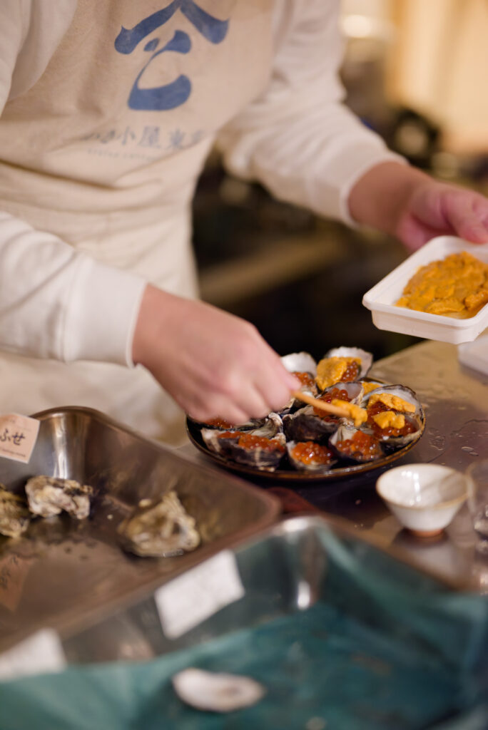 明らかに高級そうなウニとイクラまで生牡蠣にのせ始めました。笑