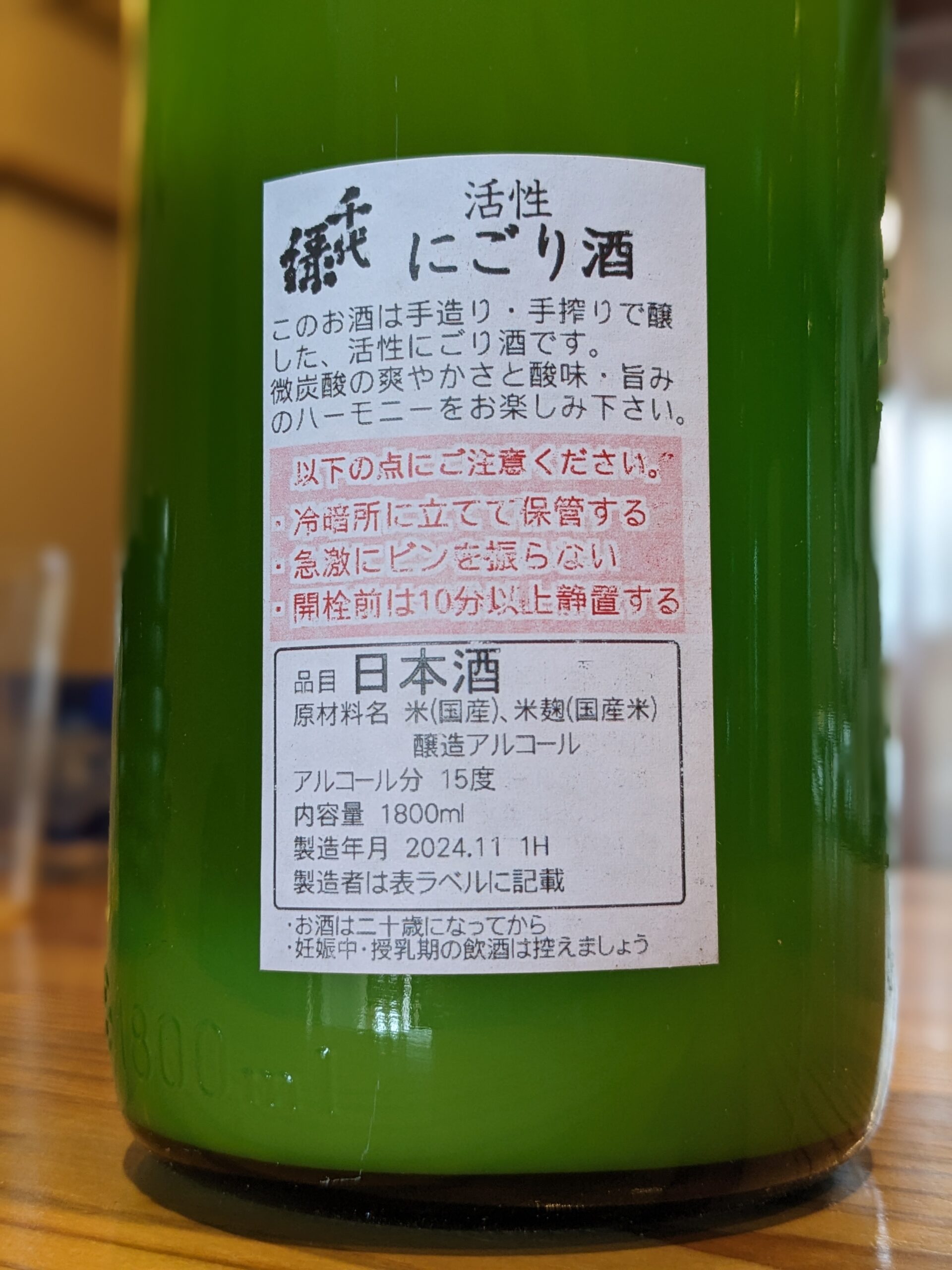 千代緑・ / 奥田酒造 日本酒 2024.12.132024.12.17 日本酒名:千代緑 酒蔵 :奥田酒造/ 秋田県大仙市協和境字境113 特定名称: 酒米 :国産 アルコール度数:15度 活性にごり酒、生酒、発泡