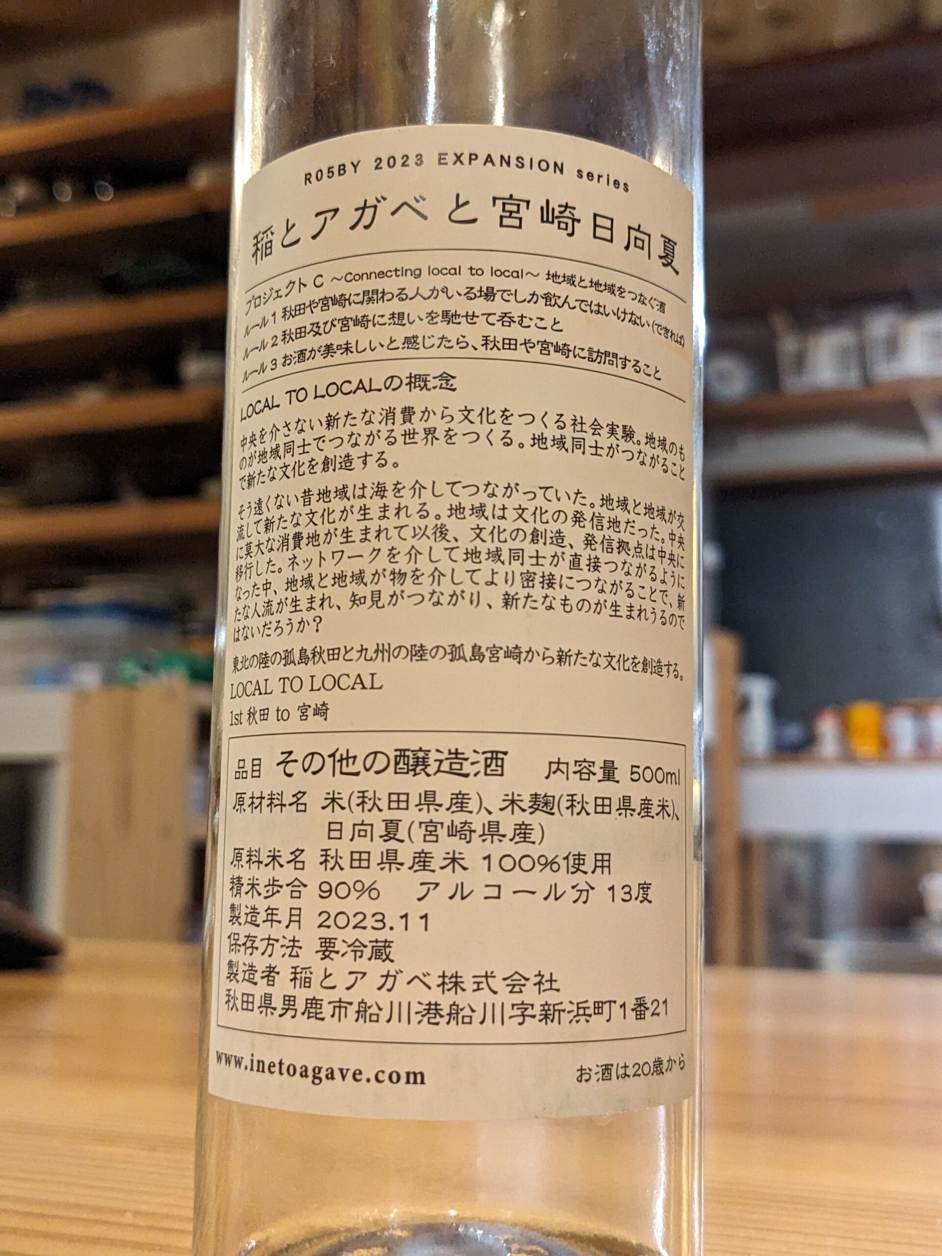 稲とアガベ・ / 稲とアガベ株式会社 日本酒 2024.12.15 日本酒名:稲とアガベ 酒蔵 :稲とアガベ株式会社/ 秋田県男鹿市船川港船川字新浜町1番21 特定名称: 酒米 :秋田県産 アルコール度数:13 宮崎日向夏