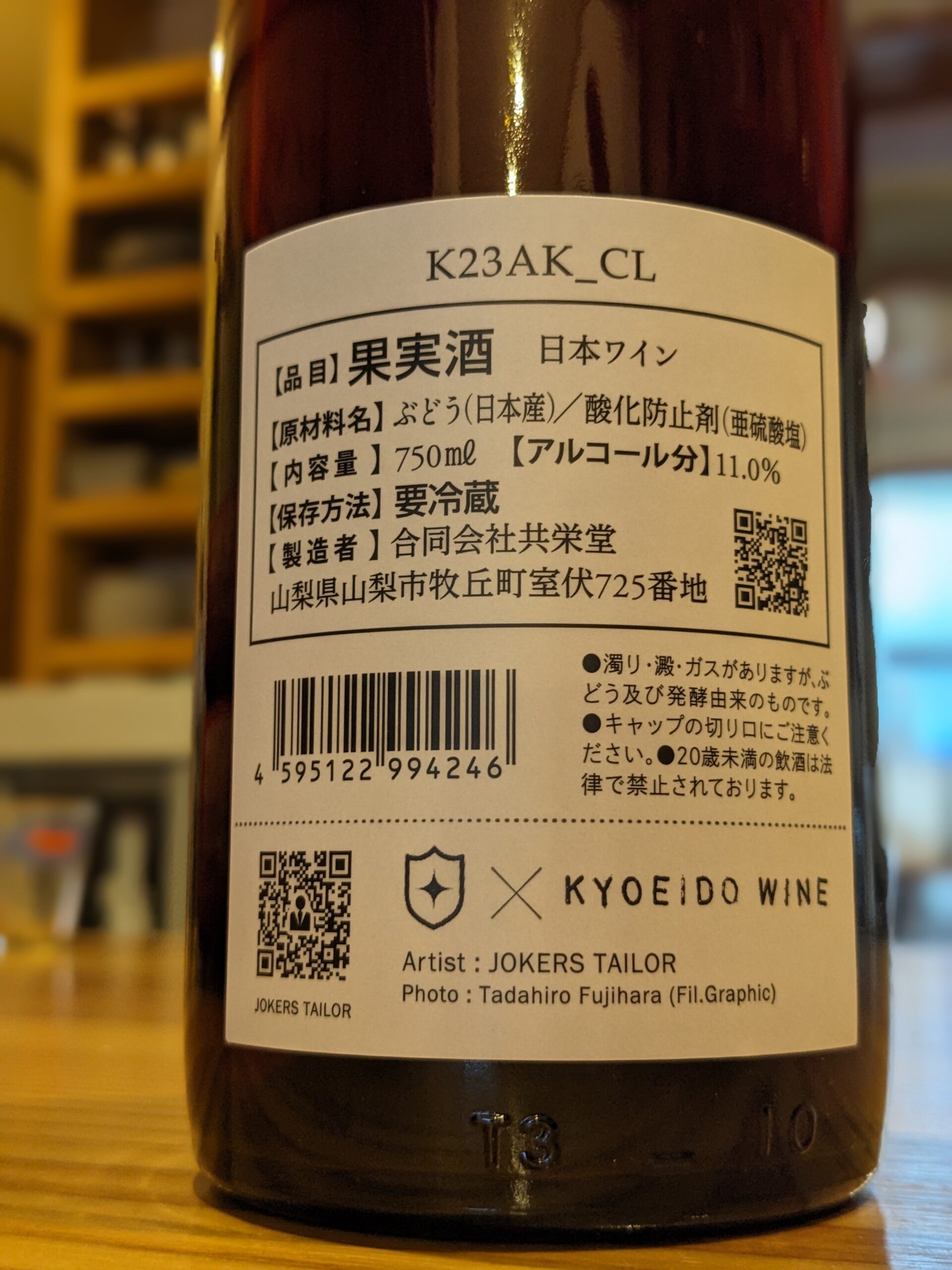 K23AK_CL 2023 / 共栄堂 ワイン 2024.12.18 ワイン名:K23AK_CL ワイナリー:共栄堂/ 山梨県山梨市牧丘室伏725番地 ワイン生産者:小林剛史 ブドウ品種: アルコール度数:11.5