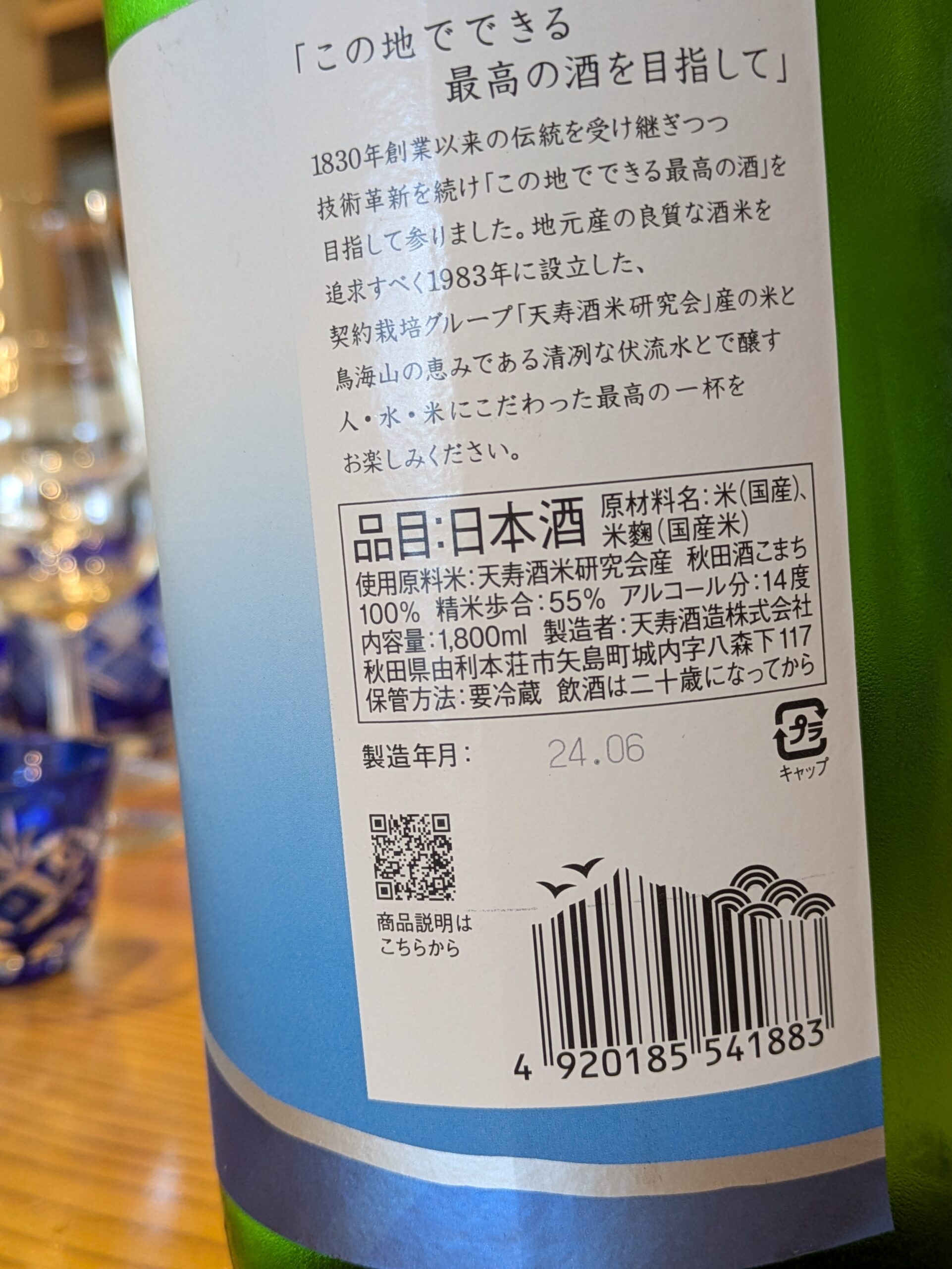 鳥海山・ / 天寿酒造株式会社 日本酒 2025.01.17 日本酒名:鳥海山 酒蔵 :天寿酒造株式会社/ 秋田県由利本荘市矢島町城内字八森下117 特定名称: 酒米 :天寿酒米研究会産 アルコール度数:14 爽快辛口