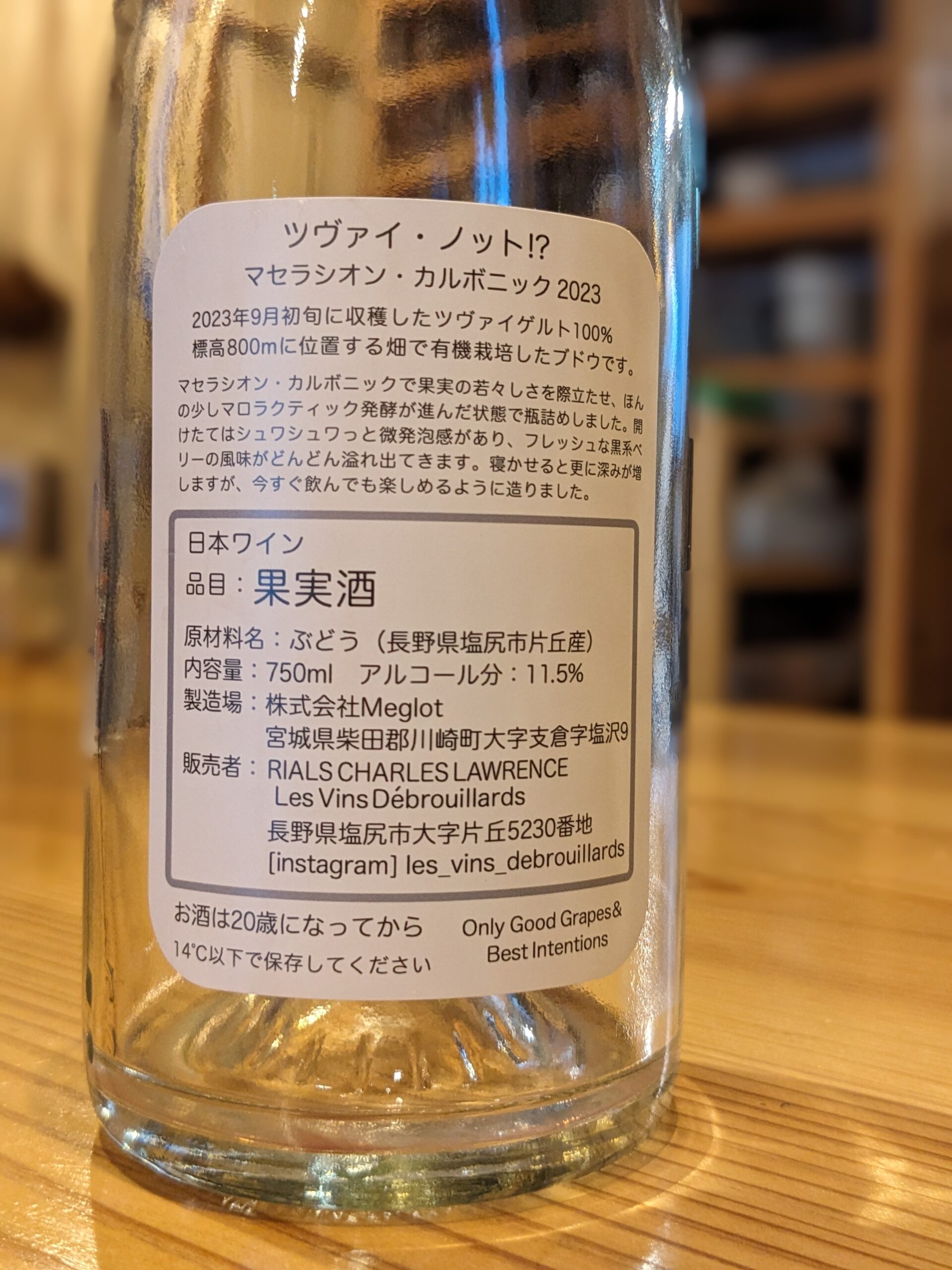 zmei not!? 2023 / 株式会社Meglot ワイン 2025.04.13 ワイン名:zmei not!? ワイナリー:株式会社Meglot/ 宮城県柴田郡川崎町大字支倉字塩沢9 ワイン生産者: ブドウ品種:ツヴァイゲルト アルコール度数:11.5